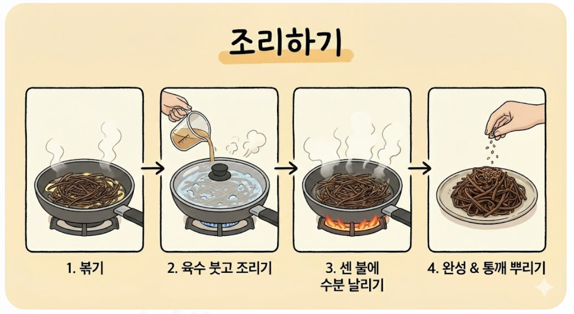 이제 본격적으로 볶아볼 차례입니다. 달궈진 팬에 식용유를 약간 두르고 재워둔 고사리를 넣어 중불에서 달달 볶습니다. 고사리가 어느 정도 열을 받아 익기 시작하면, 이때가 바로 비법 육수를 넣을 타이밍입니다. 맹물을 넣어도 되지만, 다시마 우린 물이나 멸치 육수를 반 컵(약 100ml) 정도 자작하게 부어주세요. 나물 볶는데 웬 육수냐고 하실 수 있겠지만, 묵은 나물은 기름으로만 볶으면 자칫 뻣뻣해질 수 있습니다. 수분을 더해 찌듯이 익혀야 훨씬 부드럽습니다.