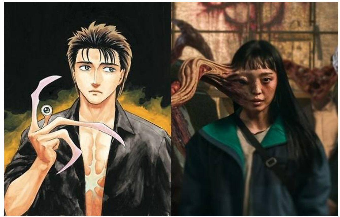 원작과 가장 큰 차이점은 주인공 정수인(전소니 분)과 기생 생물 '하이디'의 관계 설정에 있습니다. 원작의 이즈미 신이치는 기생 생물 '오른쪽이'와 뇌를 공유하지 않고 오른손을 통해 실시간으로 대화를 나누며 유대감을 쌓지만, 정수인은 치명적인 상처를 입은 뇌의 일부를 하이디가 점령하며 변종이 됩니다. 이로 인해 두 존재는 직접적인 대화가 불가능하며, 하루에 단 15분만 의식을 교체하는 불완전한 공생 관계를 유지합니다. 이는 극의 긴장감을 극대화하는 요소로 작용하며, 서로 소통할 수 없는 타자가 내 몸 안에 존재한다는 근원적인 공포를 더 깊게 파고듭니다.