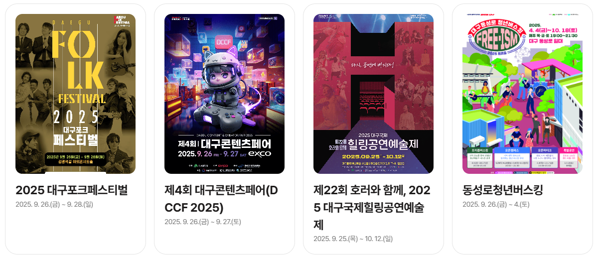 | 지역축제 | 대구포페스티벌 | 9.25~9.28 | 김광석길 |