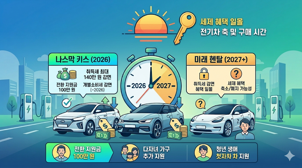 2026년은 전기차 구매 예정자들에게 '골든 타임'이자 동시에 '마지막 기회'가 될 가능성이 높습니다. 현재 전기차 구매 시 적용되는 취득세 감면(최대 140만 원) 혜택이 2026년 12월 31일을 기점으로 끝나게 될 예정이기 때문입니다. 또한 개별소비세와 교육세 등 합산 시 약 400만 원 이상의 세금 절감 효과를 누릴 수 있는 현행 제도가 내년에도 동일하게 유지될지는 불확실합니다. 정부의 세수 확보 기조를 고려할 때, 혜택이 축소되거나 단계적으로 폐지될 확률이 높아 보입니다. 따라서 차량 교체 주기가 도래한 소비자라면 2026년 하반기보다는 물량이 확보되는 상반기에 계약을 진행하는 것이 안전할 것으로 보입니다.