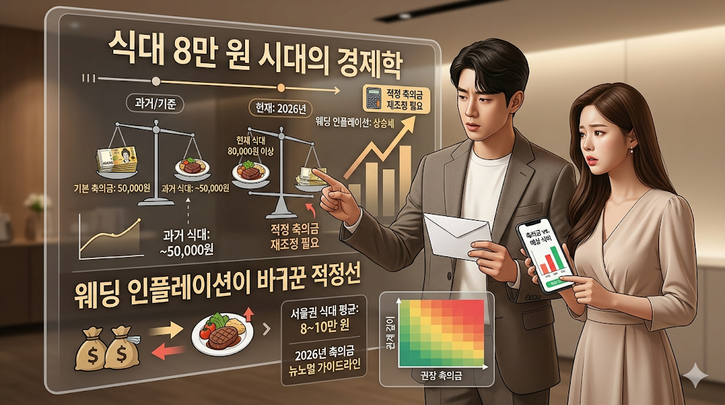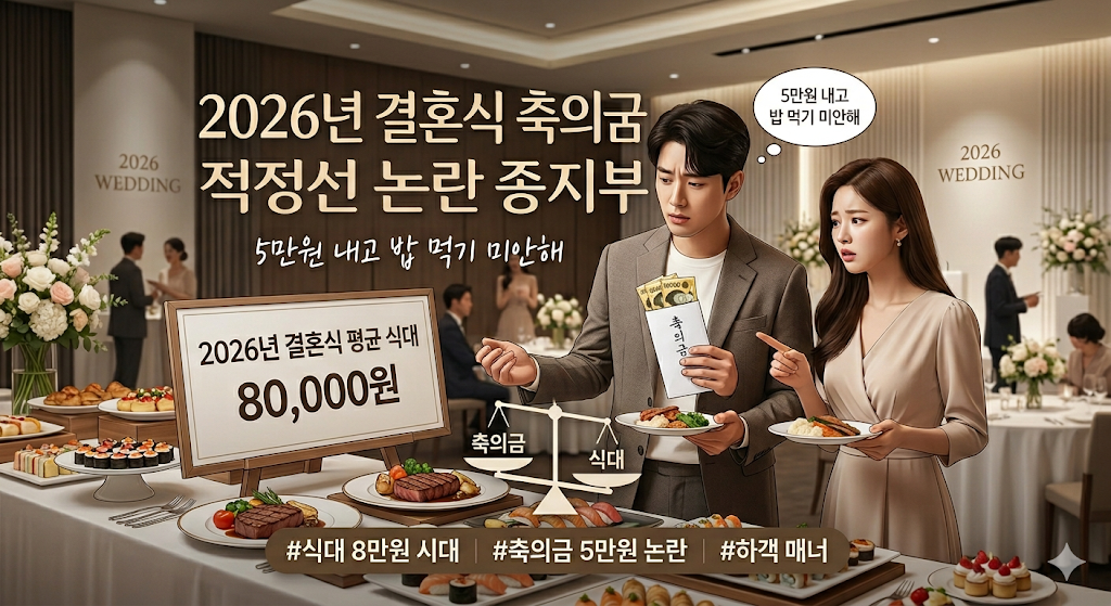 2026년 고물가 시대, 결혼식 식대 8만 원을 넘어 10만 원 시대에 돌입하며 불거진 축의금 5만 원 논란과 적정 기준, 하객 매너를 구체적인 통계와 함께 짚어봅니다.