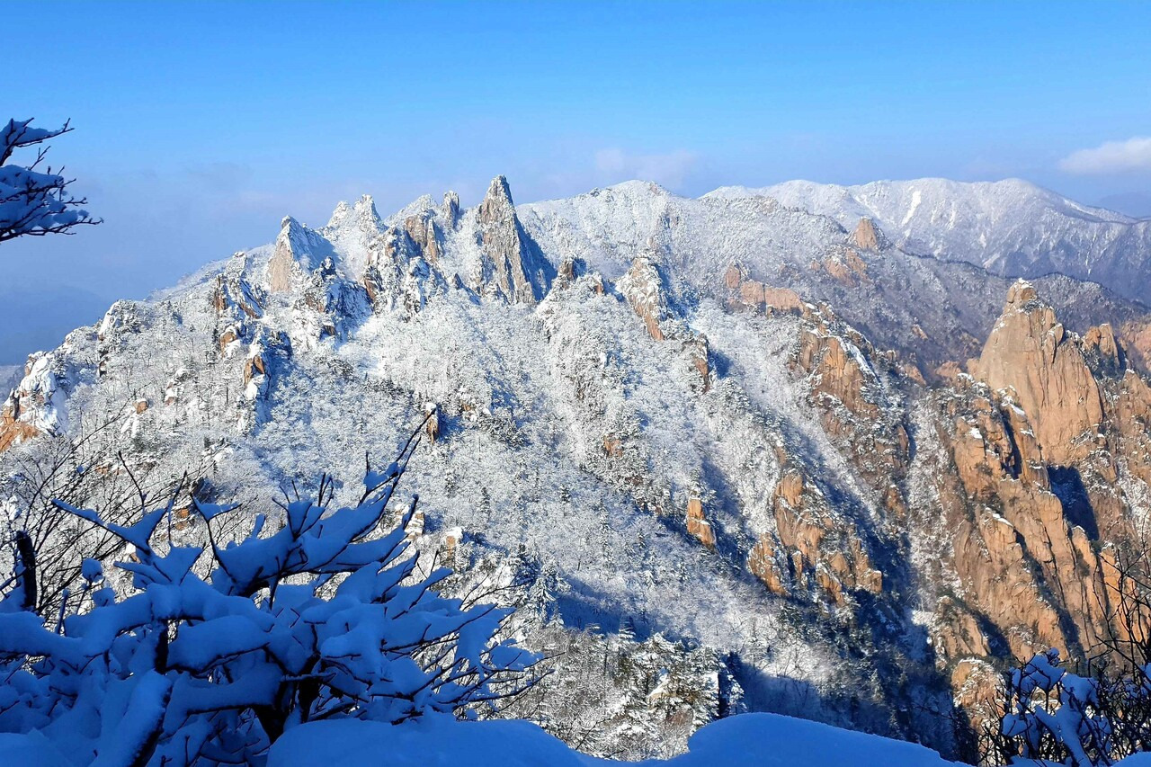 겨울 산행의 상징적인 풍경을 꼽을 때 가장 많이 언급되는 곳은 설악산입니다. 설악산은 겨울이 되면 바위 능선과 계곡, 숲이 모두 눈과 얼음으로 덮이며 전혀 다른 인상을 보여줍니다. 울산바위와 대청봉 일대는 겨울철 대표 설경으로 손꼽히며, 사진 촬영 목적의 산행객도 많이 찾는 구간입니다. 다만 기상 변화가 잦고 체감 온도가 낮아 충분한 준비와 경험이 필요합니다.