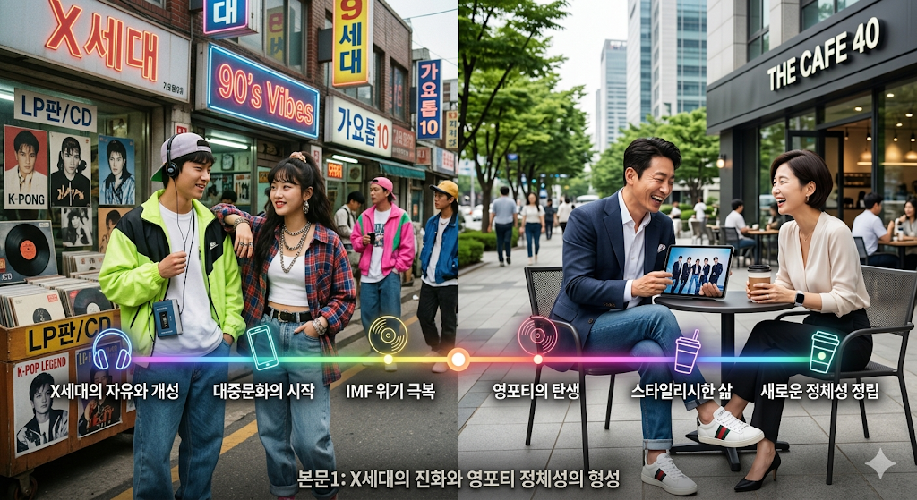 과거의 40대가 권위적이고 보수적인 ‘기성세대’의 전형이었다면, 현재의 영포티(Young Forty)는 자신만의 취향과 라이프스타일을 고수하며 젊은 세대와 소통하려는 의지를 가진 집단으로 분류됩니다. 1970년대생을 주축으로 한 X세대가 나이가 들며 형성된 이 집단은 경제적 풍요와 대중문화의 황금기를 경험한 세대답게 기존의 ‘아저씨’ 프레임을 거부합니다. 이러한 변화는 단순한 유행을 넘어 한국 사회의 인구 구조와 소비 지형을 바꾸는 중요한 문화적 전환점으로 보입니다. 단순히 나이를 먹는 것이 아니라, 어떤 감각을 유지하며 늙어갈 것인가에 대한 담론이 본격화된 결과라고 봅니다.